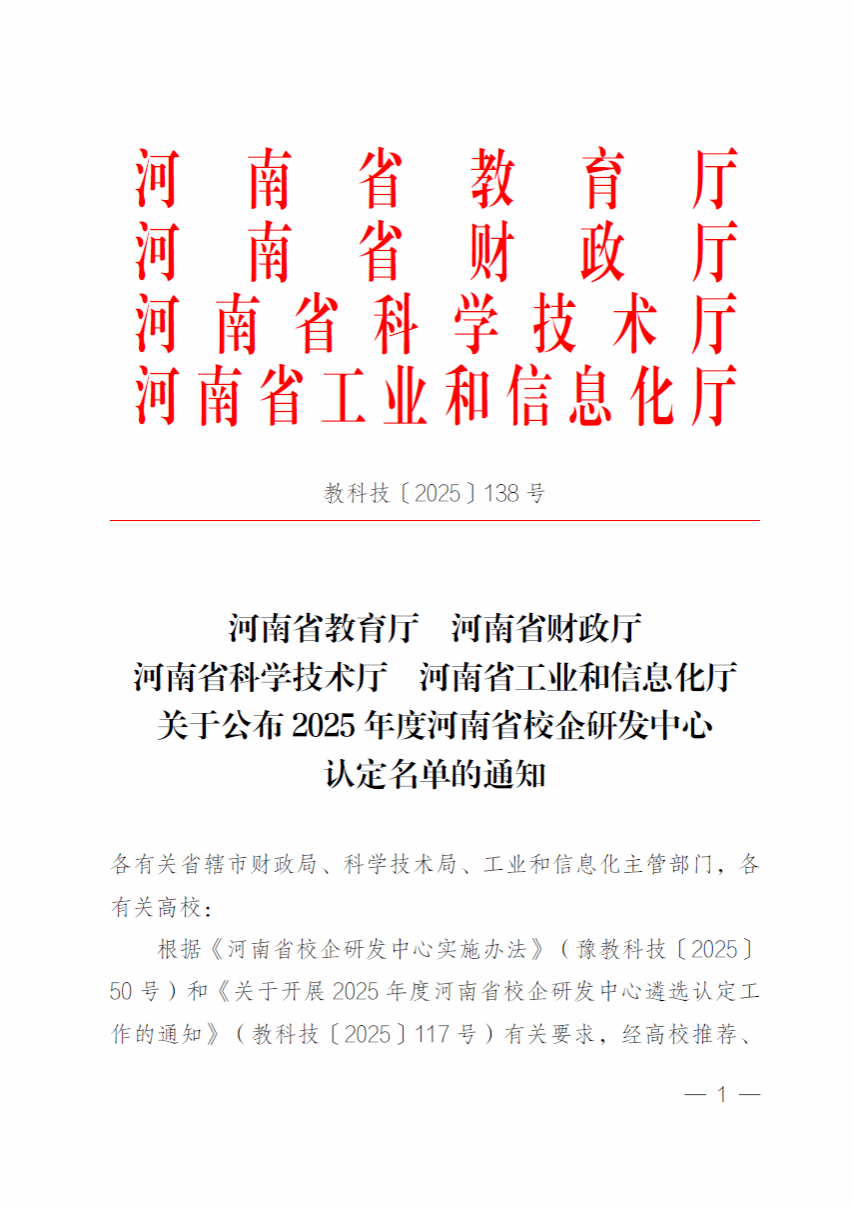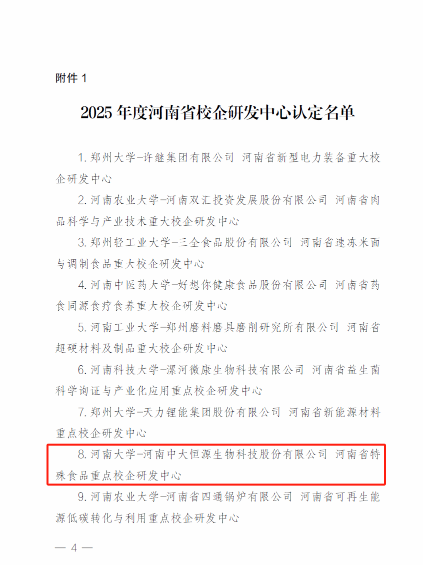 近日,河南省教育厅、财政厅、科学技术厅、工业和信息化厅联合公布了2025年度河南省校企研发中心认定名单,yl6809官网农学院康文艺教授团队与河南中大恒源生物科技股份有限公司联合共建的“特殊食品校企研发中心”获批河南省重点校企研发中心认定,获得省财政资金支持100万元。这是yl6809官网连续第二年获批河南省重点校企研发中心认定,标志着学校在校企协同创新、服务区域产业升级方面的能力稳步提升。