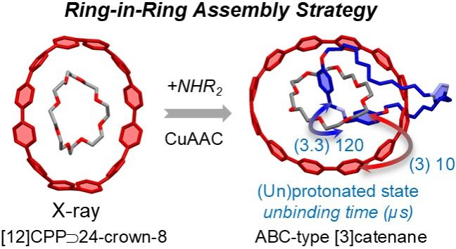 近日,徐尤智团队在Angew. Chem. Int. Ed.杂志在线发表了题为 “Ring-in-Ring Assembly Facilitates the Synthesis of a [12]Cycloparaphenylene ABC-Type [3] Catenane”的研究论文,该研究提出了一种通过环-环组装策略高效合成新型异[3]索烃分子的方法,首先合成[12]CPP、24-冠-8和长链铵盐轴线分子,并通过X射线单晶衍射成功解析了二元和三元超分子复合物的晶体结构。通过这种环-环组装策略,能够高效地一步合成[3]索烃分子,产率约为35%。此外,该团队利用分子模拟研究深入揭示了[3]索烃分子内部的复杂动力学行为。研究表明,较大的[12]CPP环能够滑过较小的冠醚环,并且质子化状态对系统的动力学具有关键作用。这一研究成果展示了环-环组装策略在机械互锁分子设计中的广阔应用前景,为新型异[n]索烃分子的合成提供了新的方法和思路。