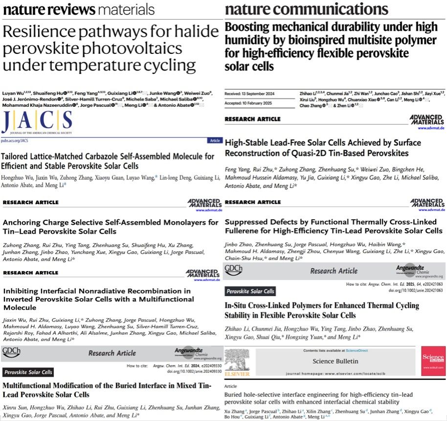 钙钛矿太阳能电池作为一种新型光伏技术,因其高效率、低成本、柔性化等特性,被视为未来光伏产业的重要发展方向。近两年李萌教授团队与其他高校课题组通力合作,在钙钛矿太阳能电池领域取得系列重要研究进展,相关研究成果发表在Nature Reviews Materials、Nature Communications、Journal of the American Chemical Society、Advanced Materials、Angewandte Chemie International Edition等国际顶级期刊。