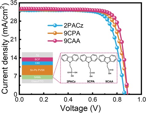 图2 基于不同Sam的锡铅钙钛矿器件J-V曲线,器件结构和SAM分子结构图(Adv. Mater., 2024, 36(18), 2312264)