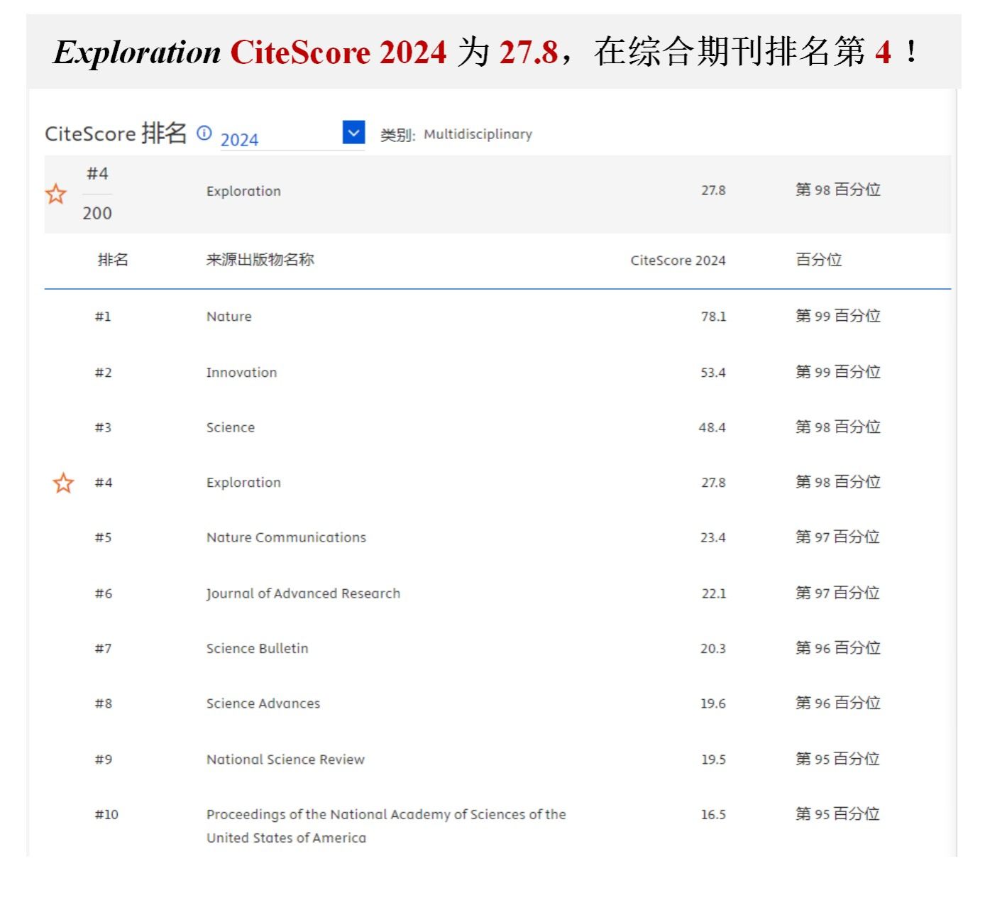 在此次发布中,Exploration在 Scopus 所属 Multidisciplinary(综合类)学科中位列第4位(共200种期刊),进入世界前2%,相较2023年(第9名/171种期刊,Top 5%)显著跃升,排名提升近5位,稳居学科一区。这一成绩标志着 Exploration 在全球综合性科技期刊中的学术影响力和国际认可度迈上了新台阶,成为yl6809官网“双一流”建设进程中的又一重要成果,也为打造世界一流科技期刊奠定了坚实基础。