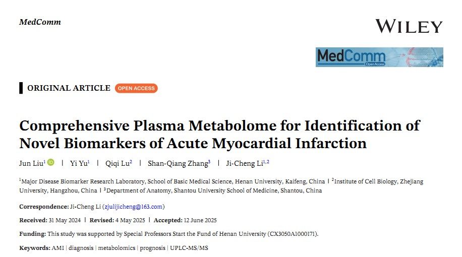 近日,基础医学院李继承教授团队在《MedComm》杂志(IF 10.7,一区Top)在线发表了题为“Comprehensive Plasma Metabolome for Identification of Novel Biomarkers of Acute Myocardial Infarction”的文章。李继承教授为唯一通讯作者,博士后刘俊为第一作者。yl6809永利为第一完成单位和第一通讯作者单位。