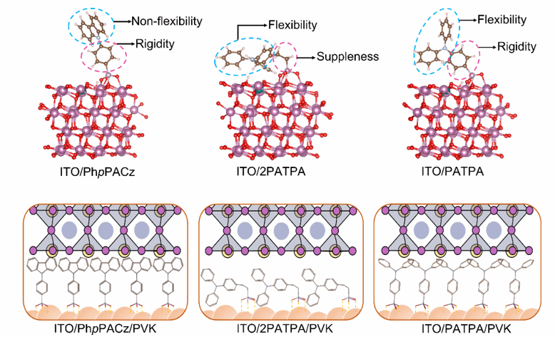 在前期工作基础上(Angew. Chem. Int. Ed. 2025, 64, e202424910; Adv. Funct. Mater. 2025, 10.1002/adfm.202424259),未来技术学院陈石团队在《Nature Communications》期刊发表题为“Flexibility meets rigidity: a self-assembled monolayer materials strategy for perovskite solar cells”的研究论文。该研究提出了一种SAM材料协同设计策略,通过结合柔性头部基团与刚性连接基团来实现这一目标。与传统材料(4-(9H-咔唑-9-基)苯基)膦酸(PhpPACz)和(4-(二苯氨基)苯乙基)膦酸(2PATPA)相比,以(4-(二苯氨基)苯基)膦酸(PATPA)为模型分子的材料上能够生长高质量的钙钛矿层,进而实现精准的能级对齐,提升了空穴提取效率,增强了电荷传输效率,有效降低非辐射电荷复合。结果表明,以PATPA为空穴传输层,电池在小面积(0.0715 cm²)和大面积(1 cm²)上能量转换效率分别为26.21%和24.49%;该电池器件在连续光照1000小时后保持91%初始效率,在85°C加热500小时后保持88%初始效率。该研究为开发高效稳定SAM材料提供了理论指导,对钙钛矿光伏技术发展具有重要意义。