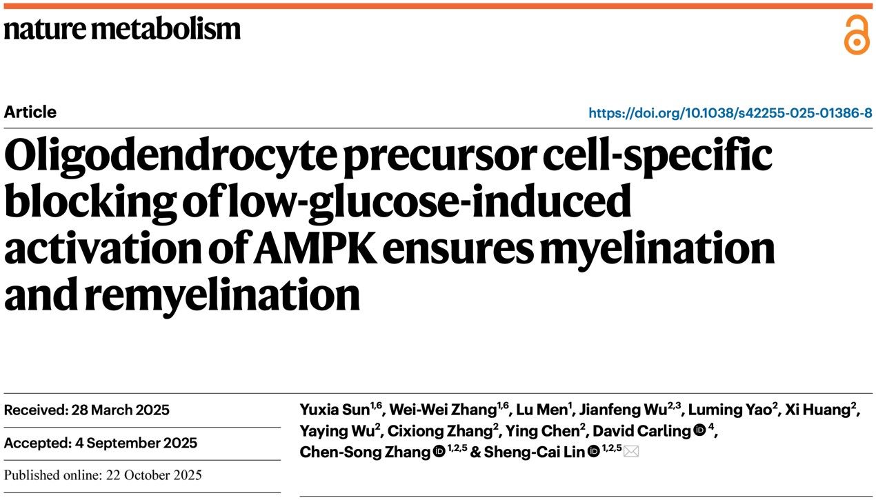 10月22日,基础医学院、中州实验室学术委员会主任林圣彩院士团队在《Nature Metabolism》杂志(IF=20.8,中科院一区Top)上发表了题为“Oligodendrocyte precursor cell-specific blocking of low-glucose-induced activation of AMPK ensures myelination and remyelination”的研究成果,首次揭示了一种确保大脑髓鞘正常形成和再生的关键分子“开关”,为治疗多发性硬化症等脱髓鞘疾病提供了全新的潜在治疗靶点和策略。