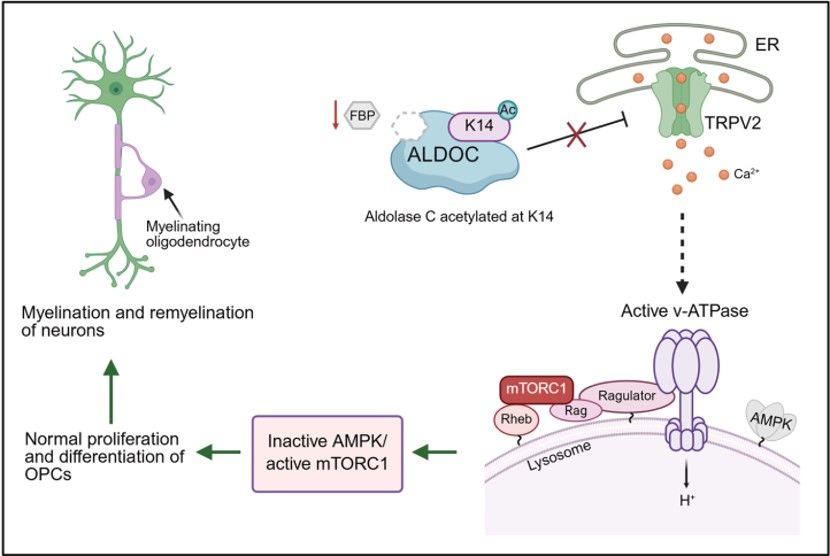 ALDOC乙酰化调控AMPK-mTORC1促进髓鞘再生分子机制图