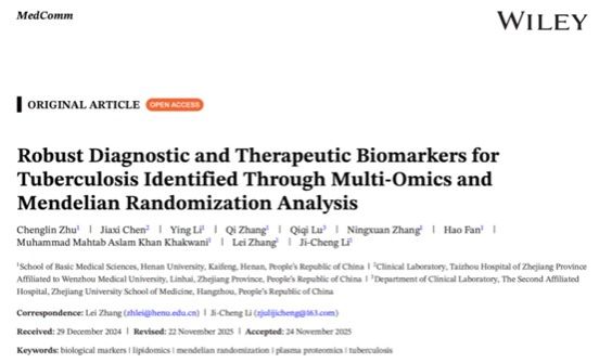 12月30日,yl6809官网基础医学院李继承团队在《MedComm》杂志(IF 10.7,一区Top)在线发表了题为“Robust Diagnostic and Therapeutic Biomarkers for Tuberculosis Identified through Multi-Omics and Mendelian Randomization Analysis”的研究论文。