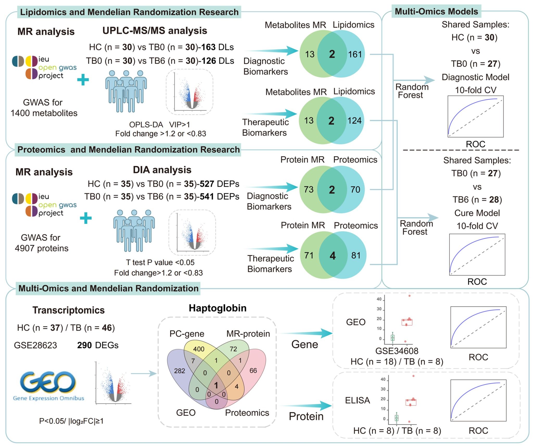 该研究采用UPLC-MS/MS脂质组学和DIA蛋白质组学技术,分析健康对照组、结核病患者及治愈组的血浆样本,鉴定差异表达的脂质和蛋白质。通过对1400种血浆代谢物和4907种血浆蛋白的孟德尔随机化分析,优先筛选出磷脂酰胆碱类脂质(PC(18:2/18:2)、PC(14:0/20:4)和 PC(18:0/20:4))及结合珠蛋白(HP)、视黄醇结合蛋白 4(RBP4)、凝血因子 XIII B 亚基(F13B)和α-胰蛋白酶抑制剂重链 1(ITIH1)作为候选诊断和治愈生物标志物。基于这些标志物构建的二元多组学随机森林模型在诊断(AUC = 0.967,95% CI:0.928–1.000)和治愈监测(AUC = 0.981,95% CI:0.956–1.000)方面表现优异。十倍交叉验证进一步证实了模型的优异性能。与转录组数据和脂质相关基因的整合分析为 HP 提供了额外的分子支持。GSE34608 队列的独立验证(AUC = 0.965)和 ELISA 验证(AUC = 0.969)均证实了HP在基因和蛋白质层面的诊断效能。GSVA 富集分析表明,HP参与铁稳态和免疫反应通路,揭示其在结核分枝杆菌感染及通过调节宿主铁代谢实现免疫逃避中可能发挥重要作用。该研究提出了一套优异的脂质-蛋白质生物标志物组合及精确的多组学模型,可用于结核病诊断和治愈监测,并提出 HP 作为一个有前景的生物标志物和潜在治疗靶点。