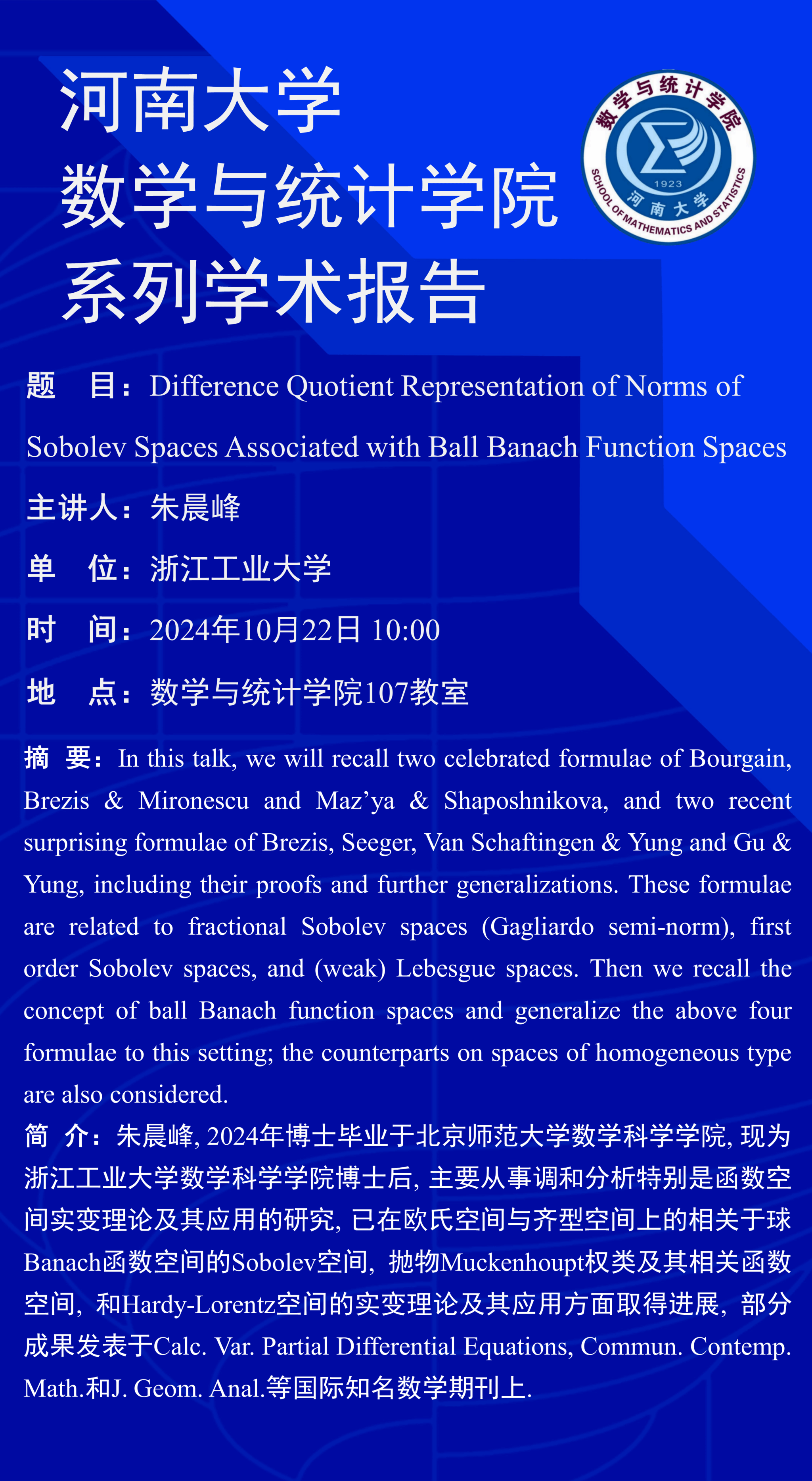 下一篇:朱晨峰:Parabolic Muckenhoupt Weights and Function Spaces Tailored to Doubly Nonlinear Parabolic PDEs(时间:10月21日)