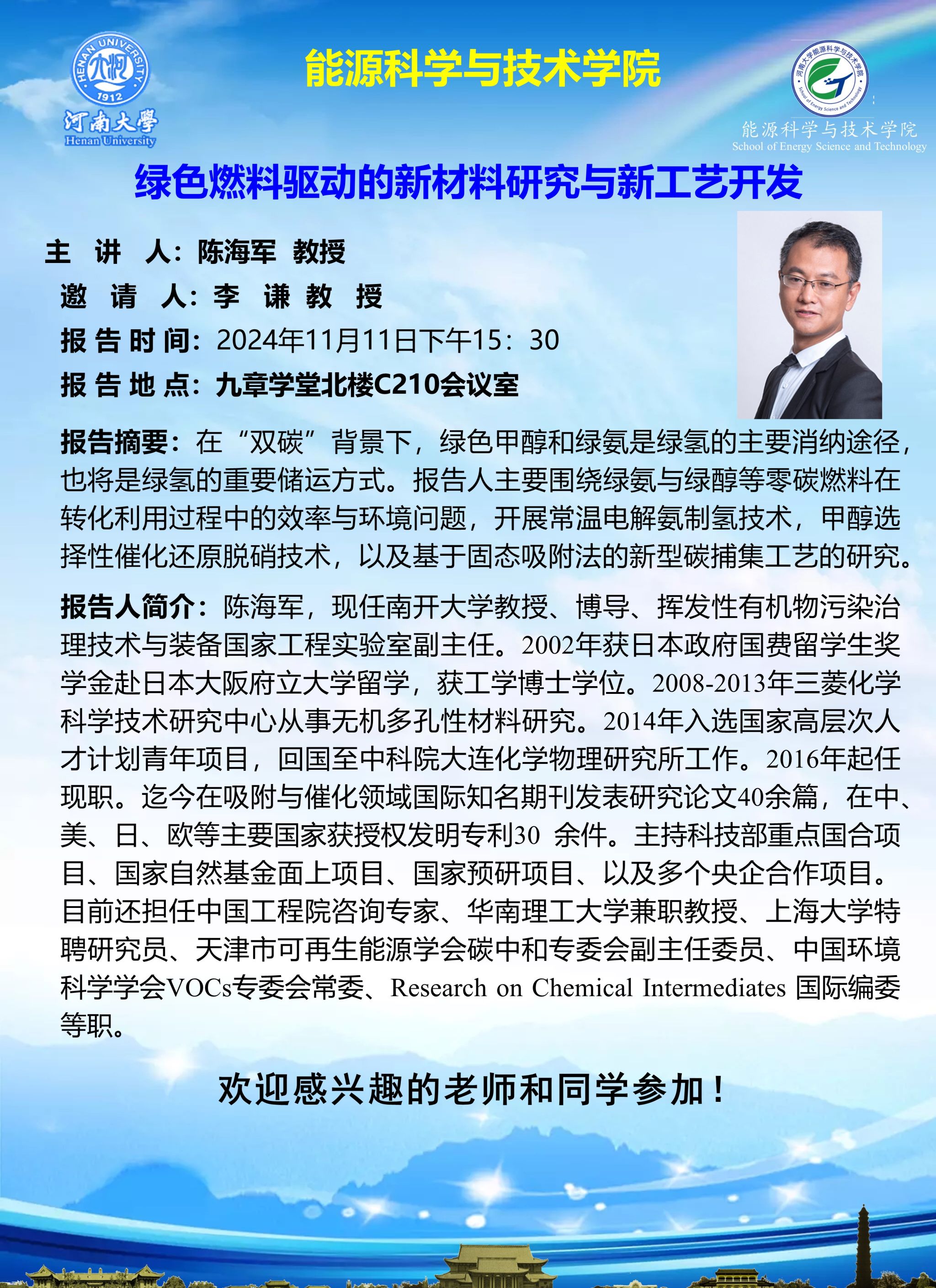 陈海军:绿色燃料驱动的新材料研究与新工艺开发(时间:11月11日)