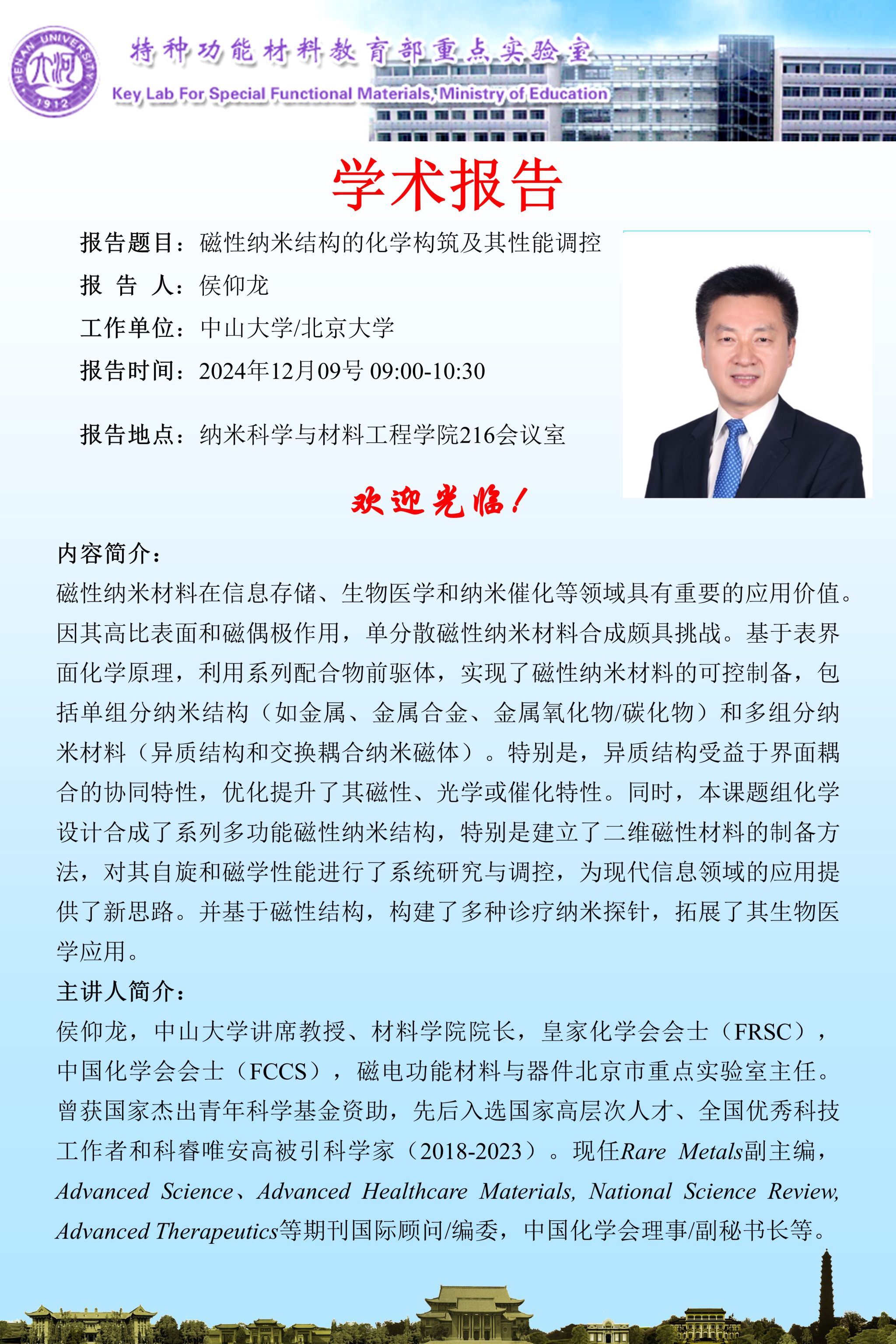 侯仰龙:磁性纳米结构的化学构筑及其性能调控(时间:12月09日)