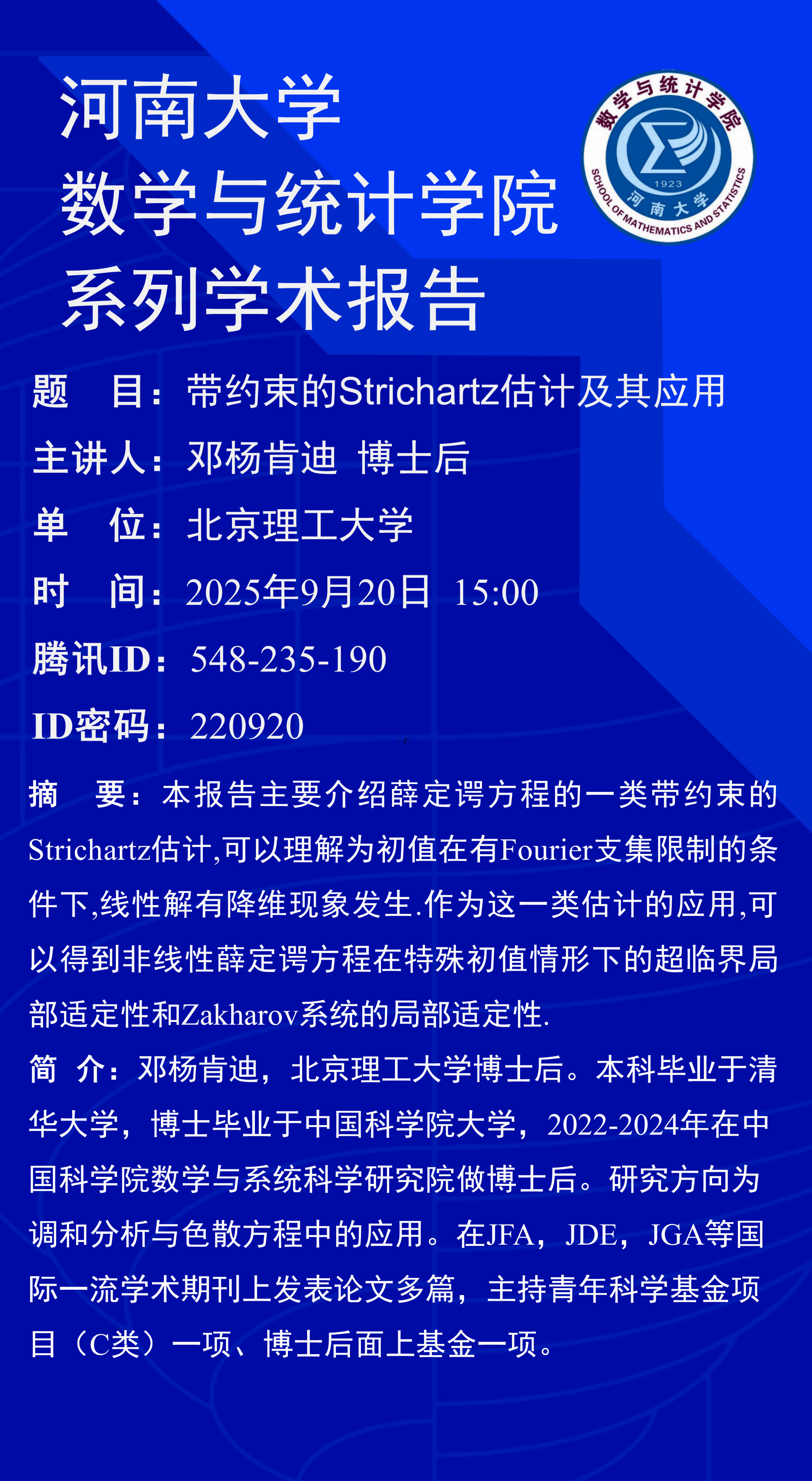 邓杨肯迪:带约束的Strichartz估计及其应用(时间:9月20日)