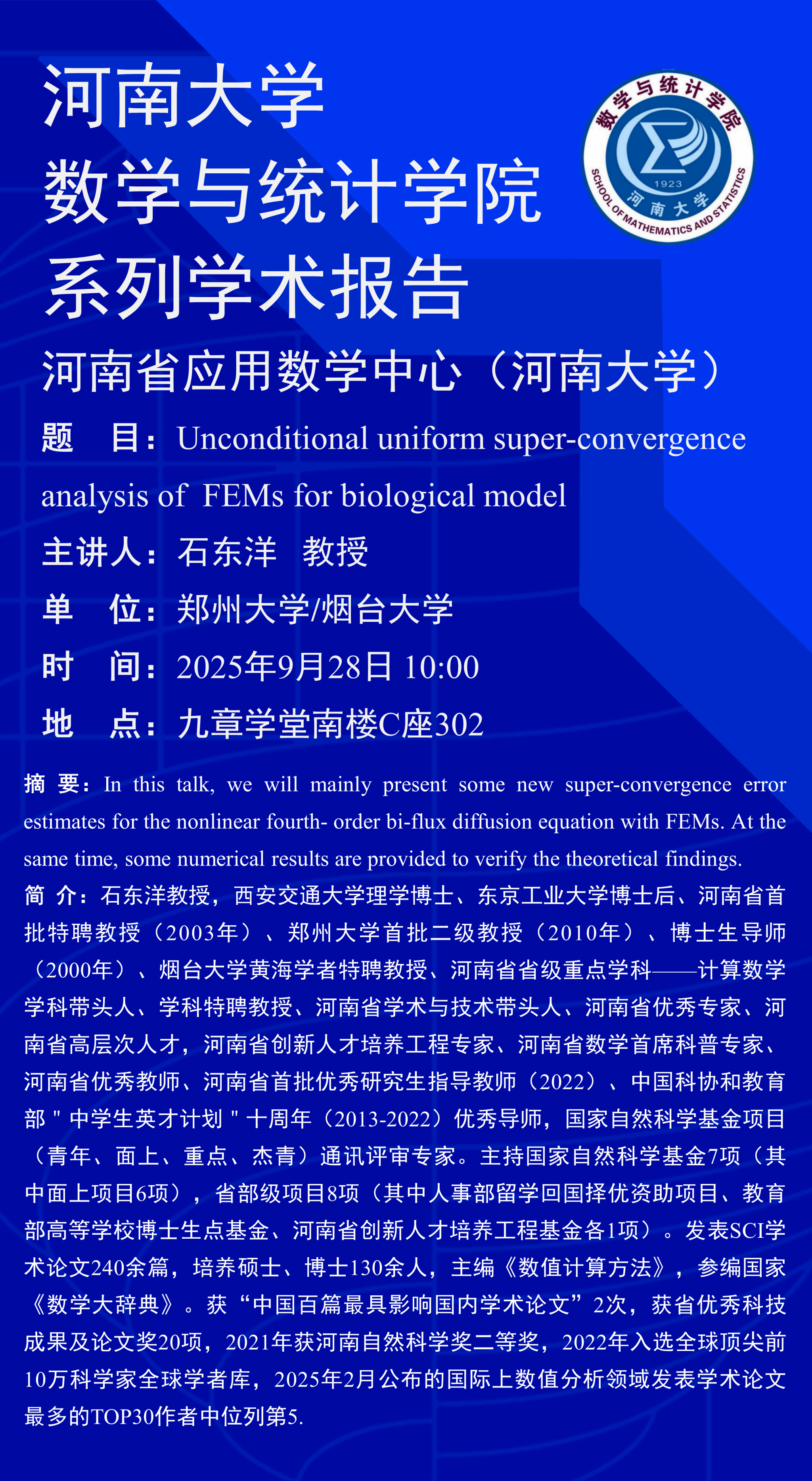 石东洋:Unconditional uniform super-convergence analysis of FEMs for biological model(时间:9月28日)