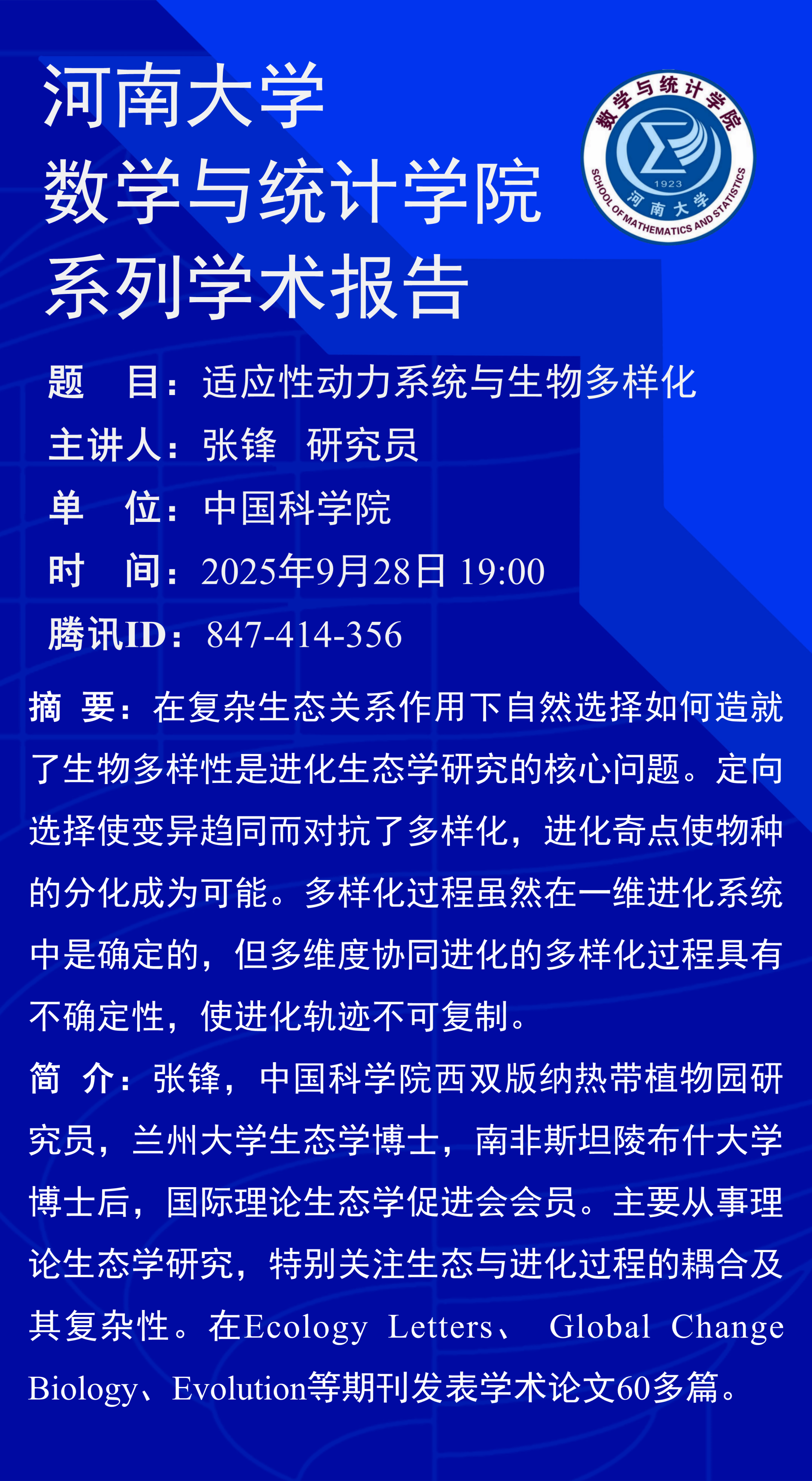 张锋:适应性动力系统与生物多样化(时间:9月28日)
