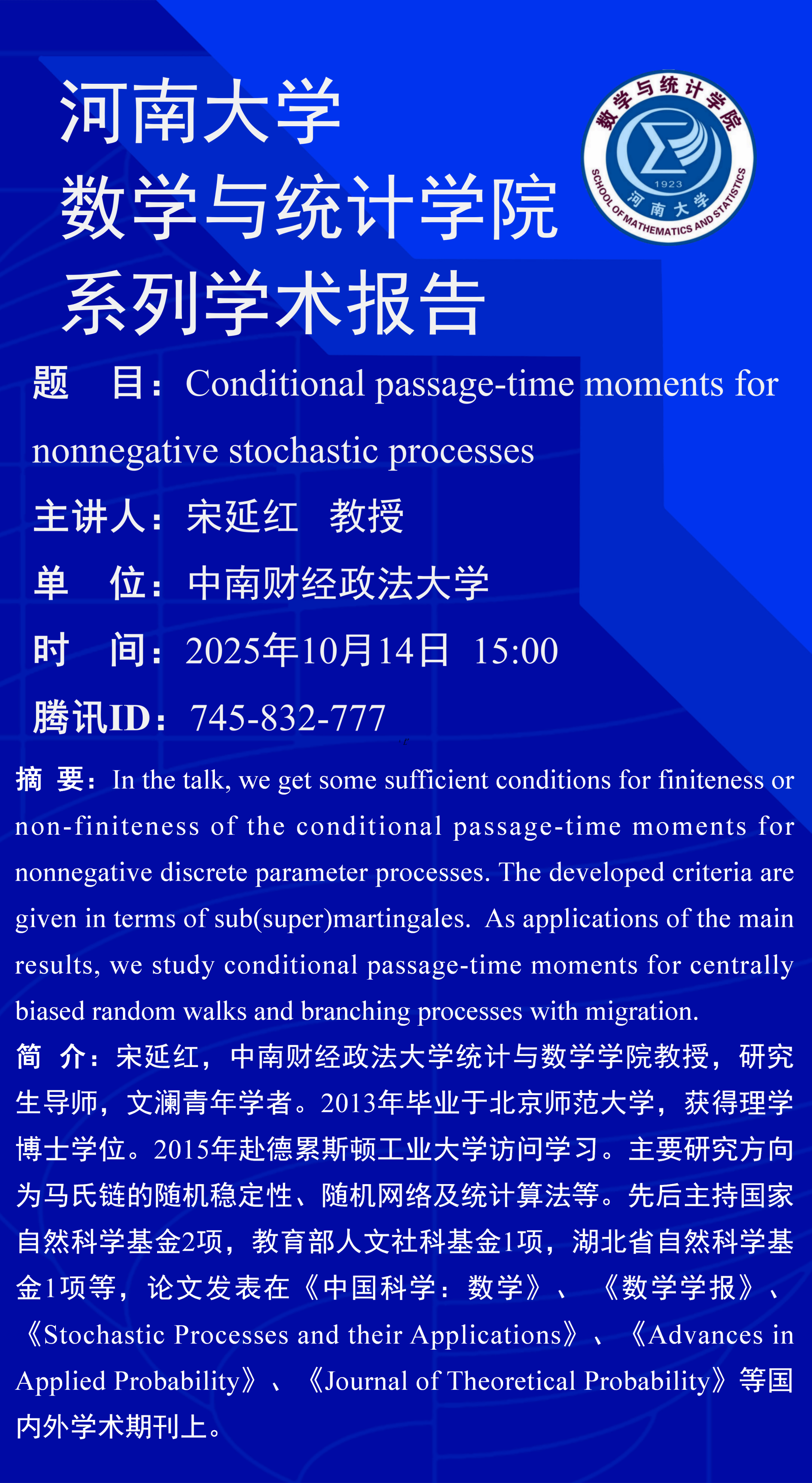 宋延红:Conditional passage-time moments for nonnegative stochastic processes(时间:10月14日)