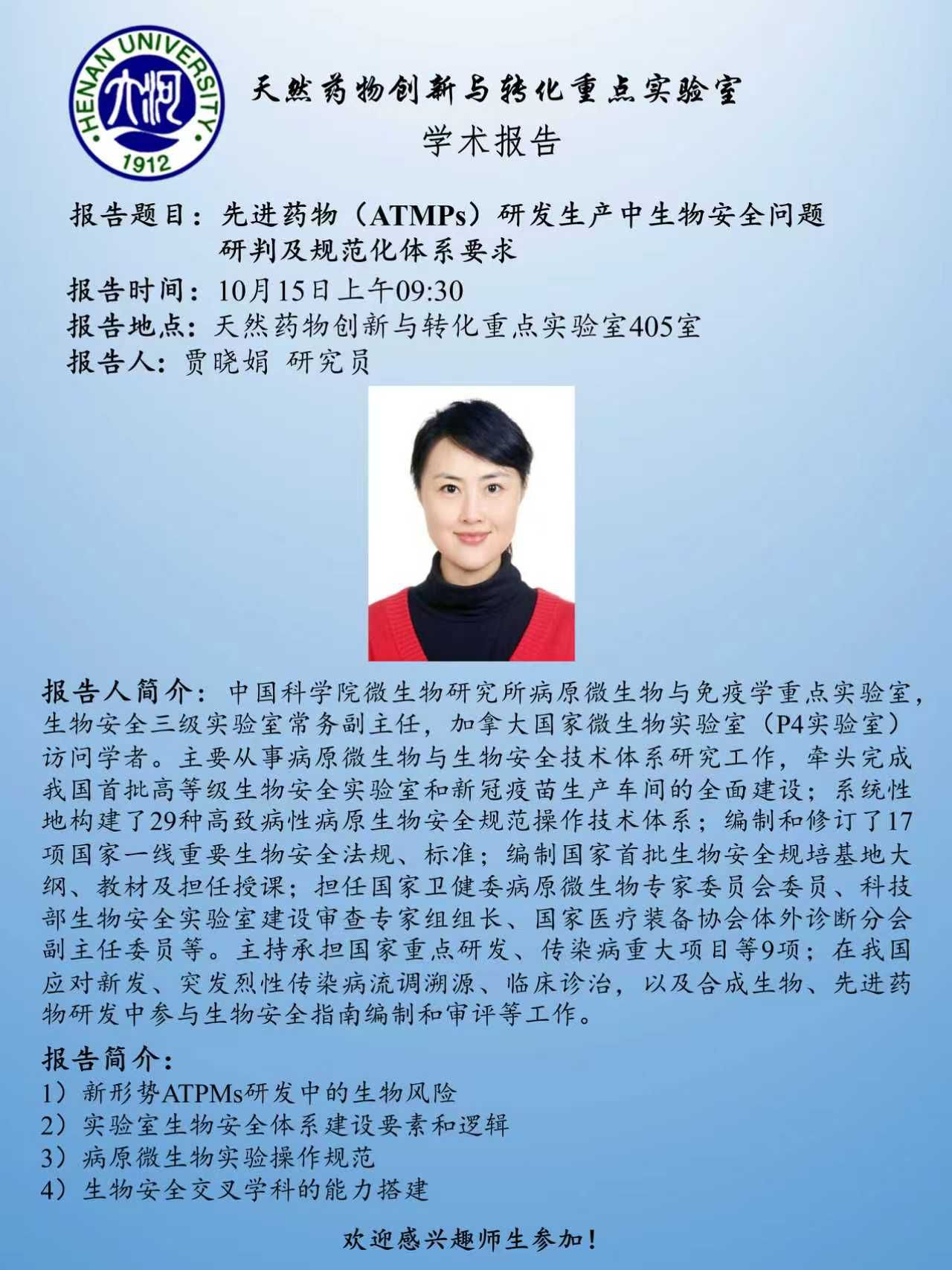 贾晓娟:先进药物(ATMPs)研发生产中生物安全问题研判及规范化体系要求 (时间:10月15日)