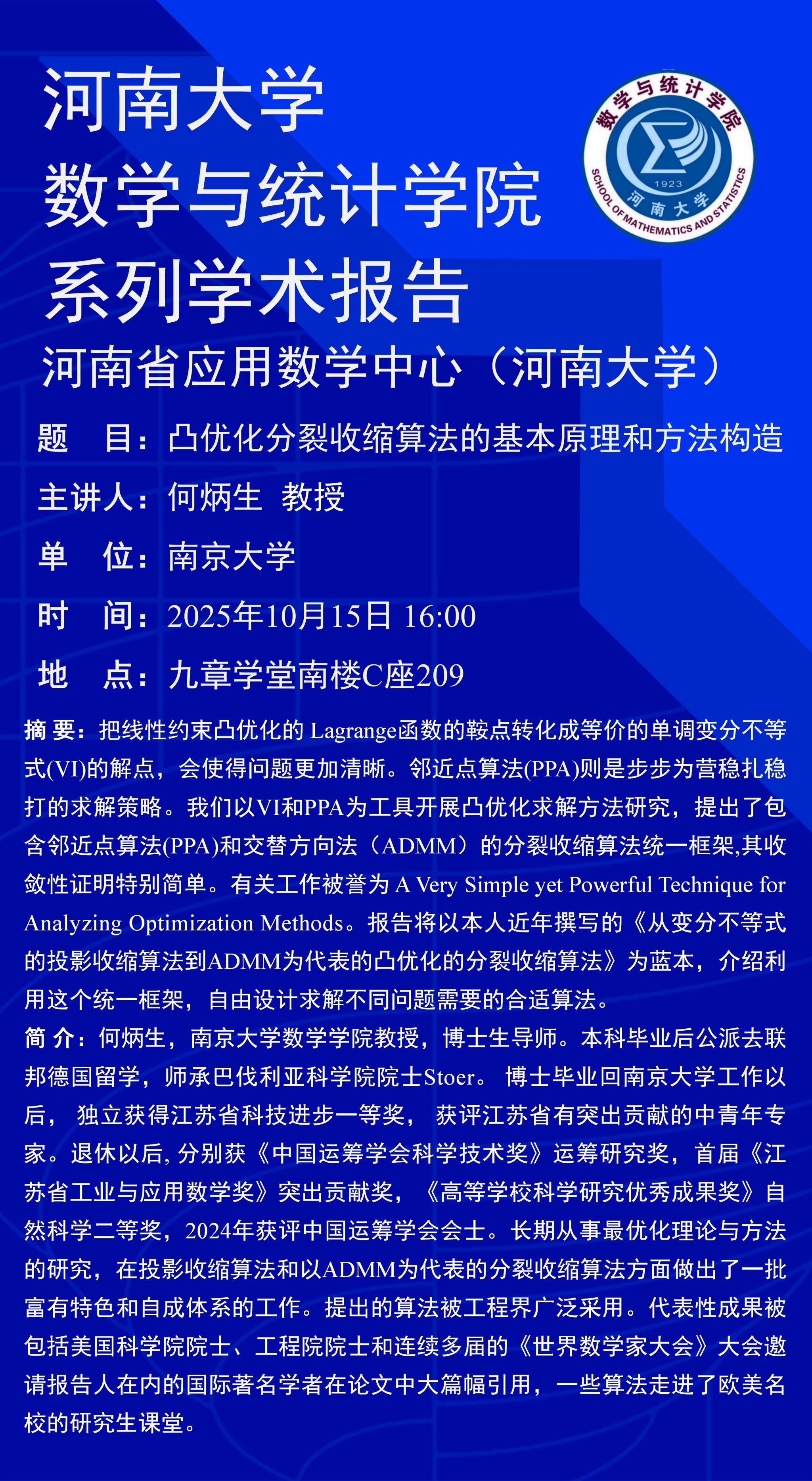 何炳生:凸优化分裂收缩算法的基本原理和方法构造(时间:10月15日)