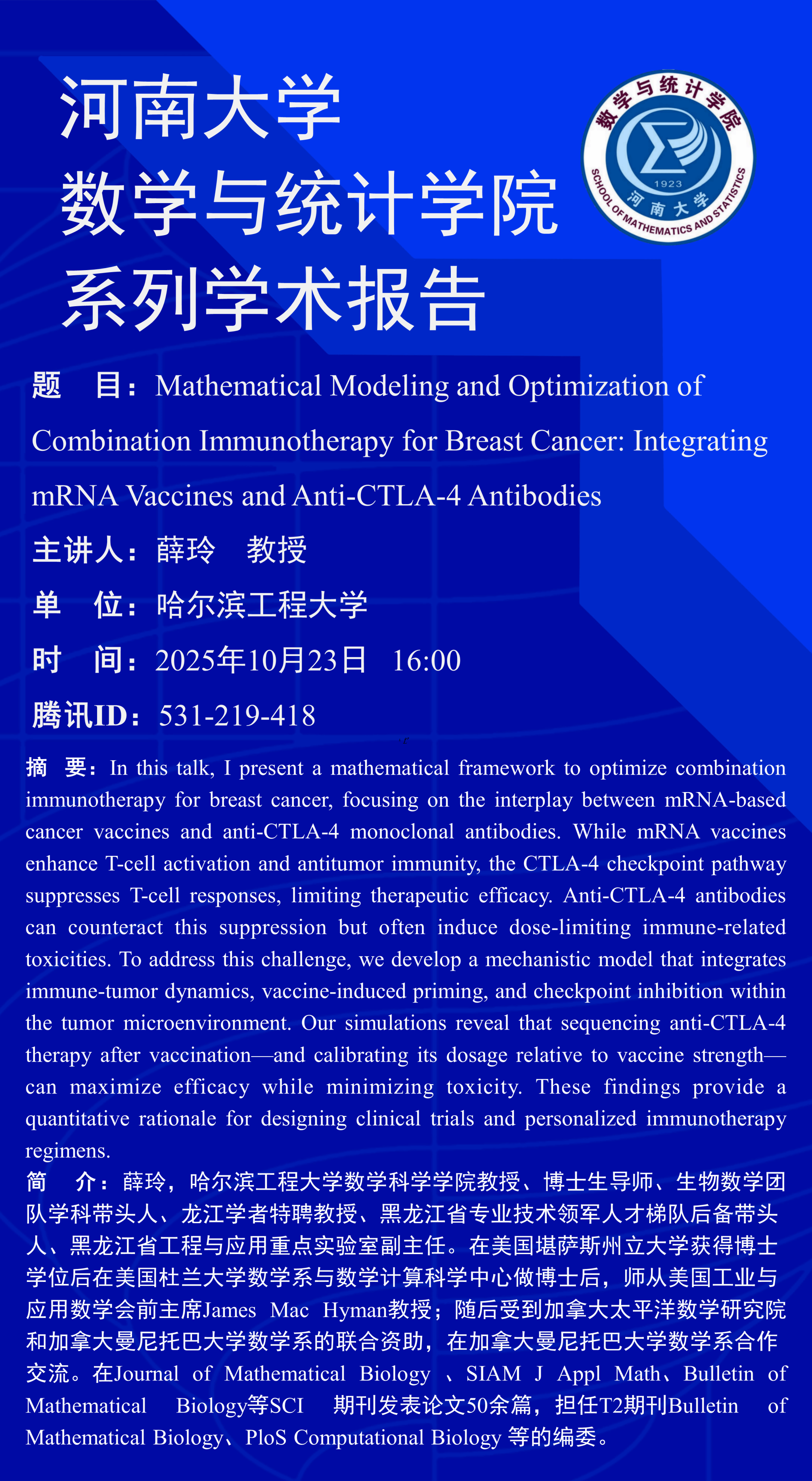 薛玲:Mathematical Modeling and Optimization of Combination Immunotherapy for Breast Cancer: Integrating mRNA Vaccines and Anti-CTLA-4 Antibodies(时间:10月23日)