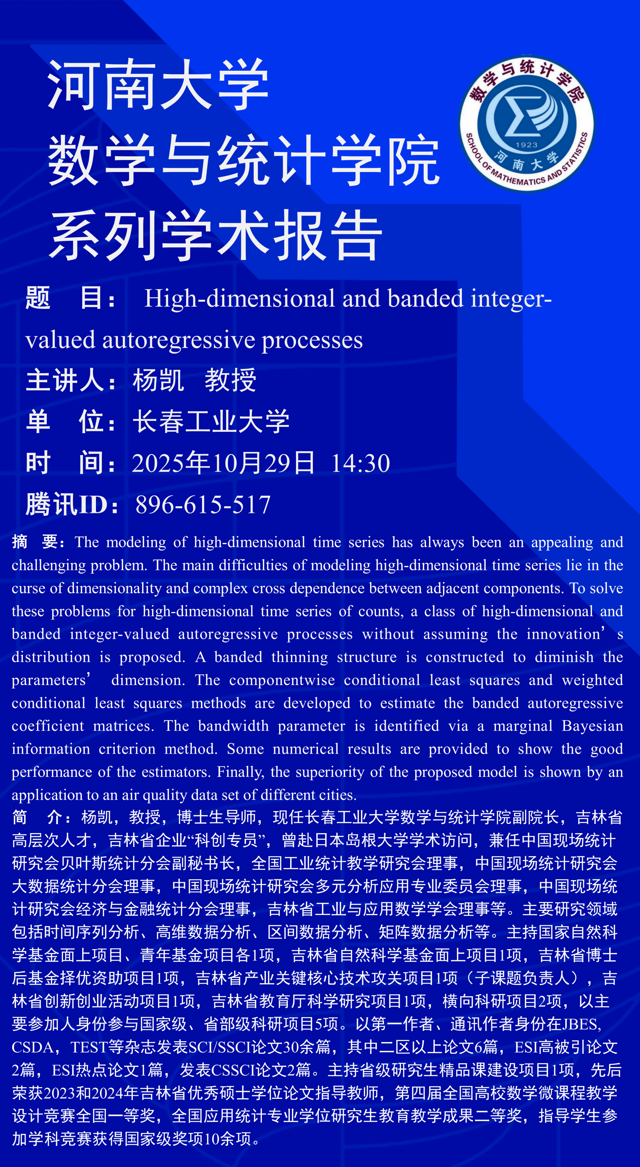 杨凯:High-dimensional and banded integer-valued autoregressive processes(时间:10月29日)
