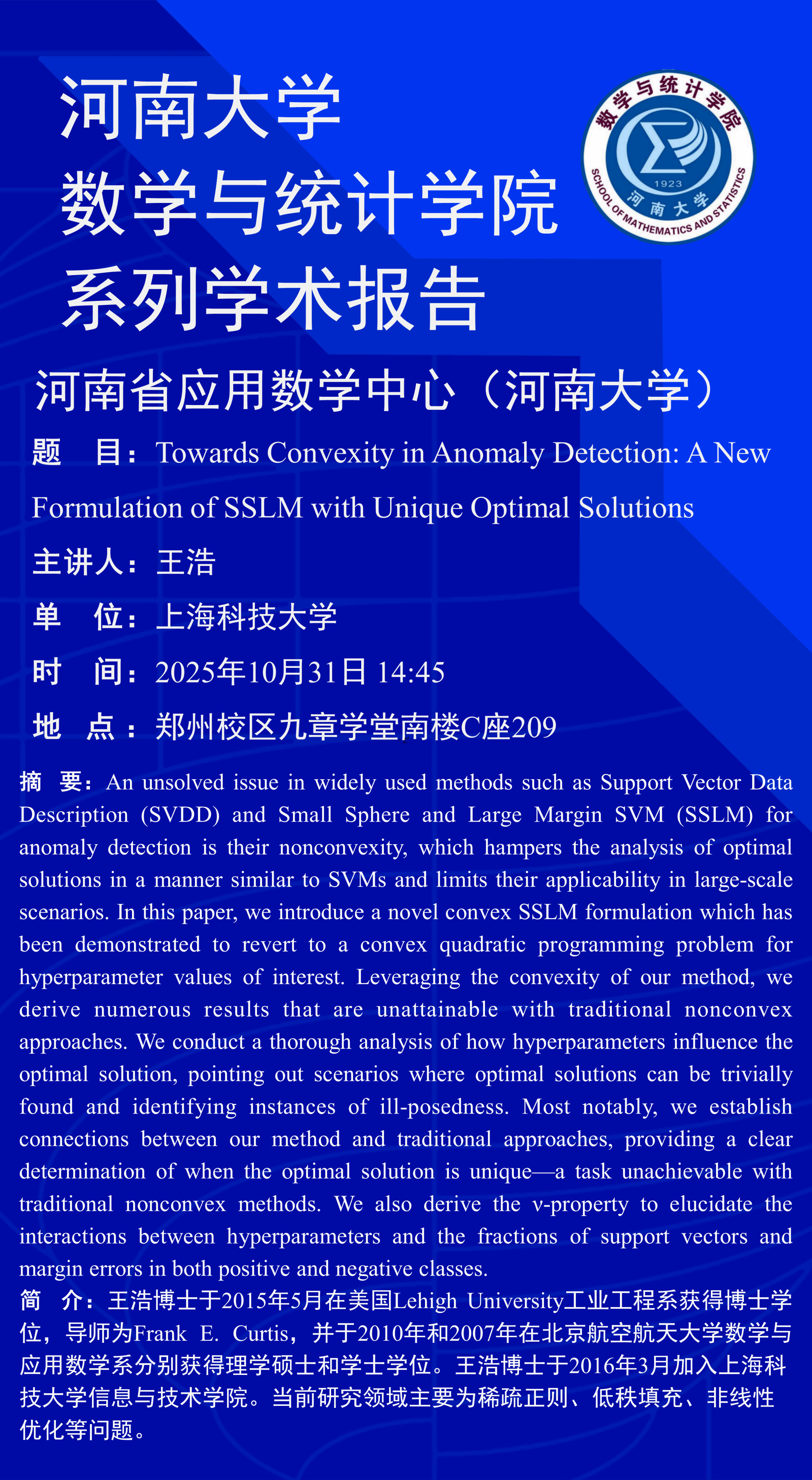 王浩:Towards Convexity in Anomaly Detection: A New Formulation of SSLM with Unique Optimal Solutions(时间:10月31日)