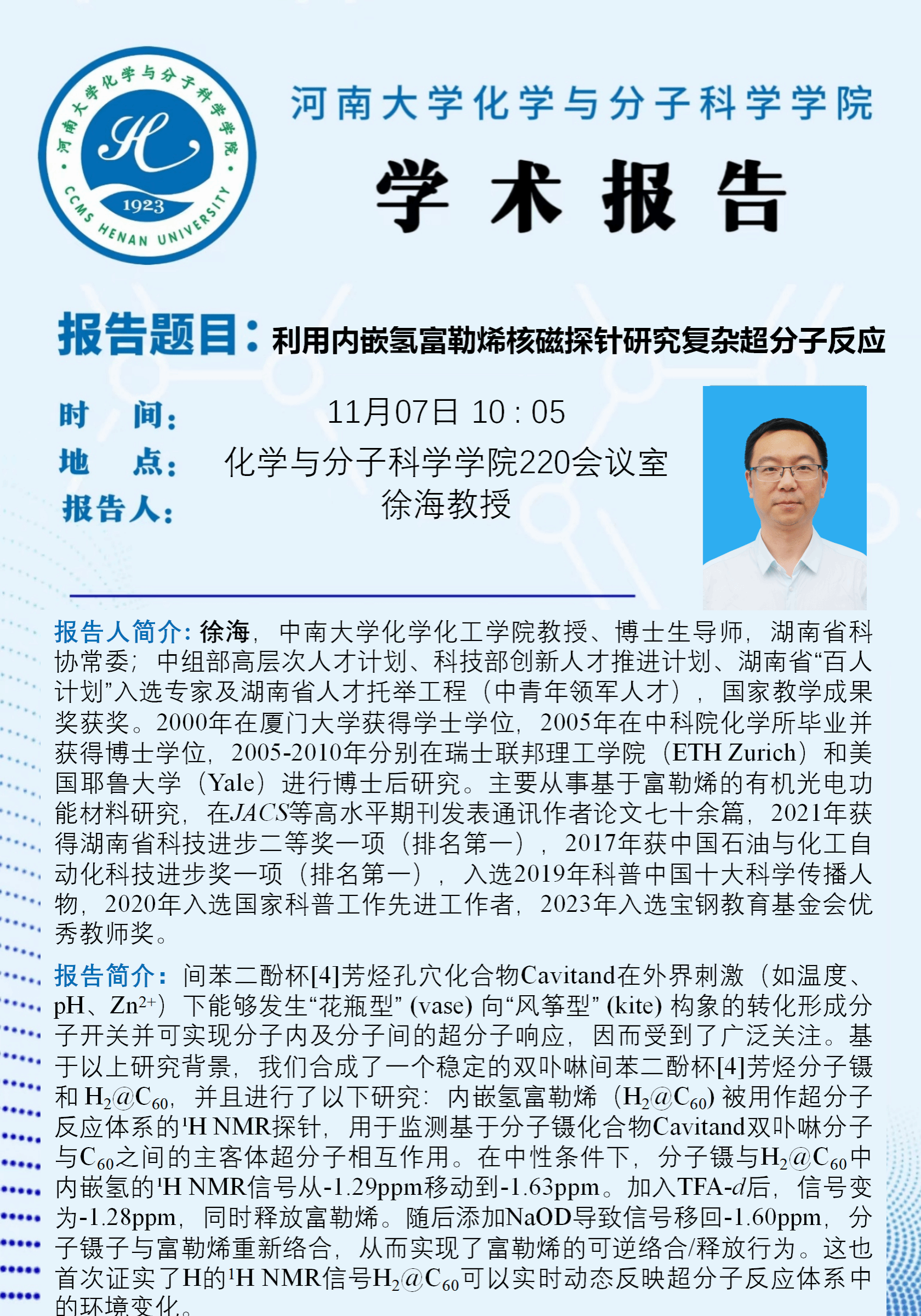 徐海:利用内嵌氢富勒烯核磁探针研究复杂超分子反应(时间:11月7日)