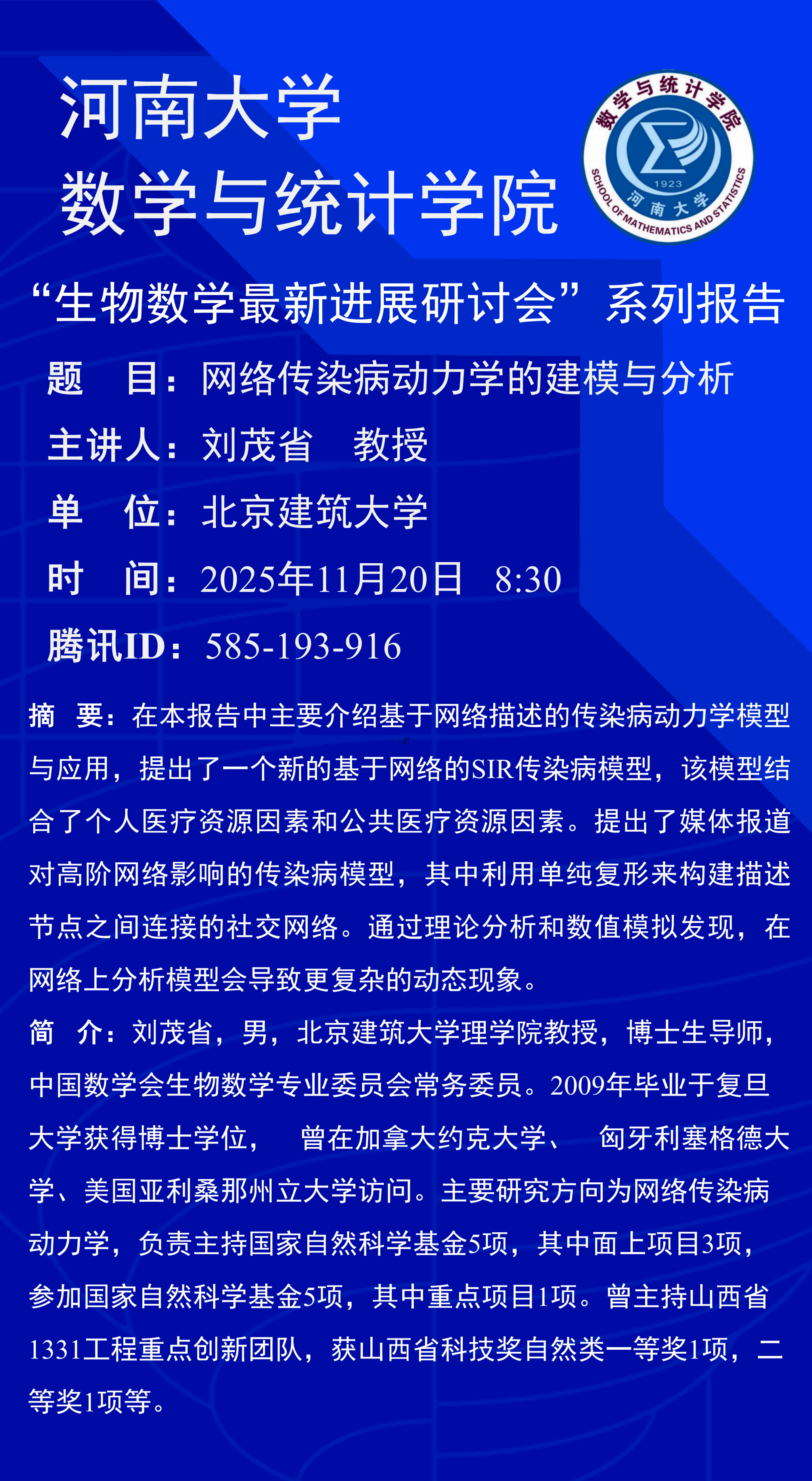 刘茂省:网络传染病动力学的建模与分析(时间:11月20日)