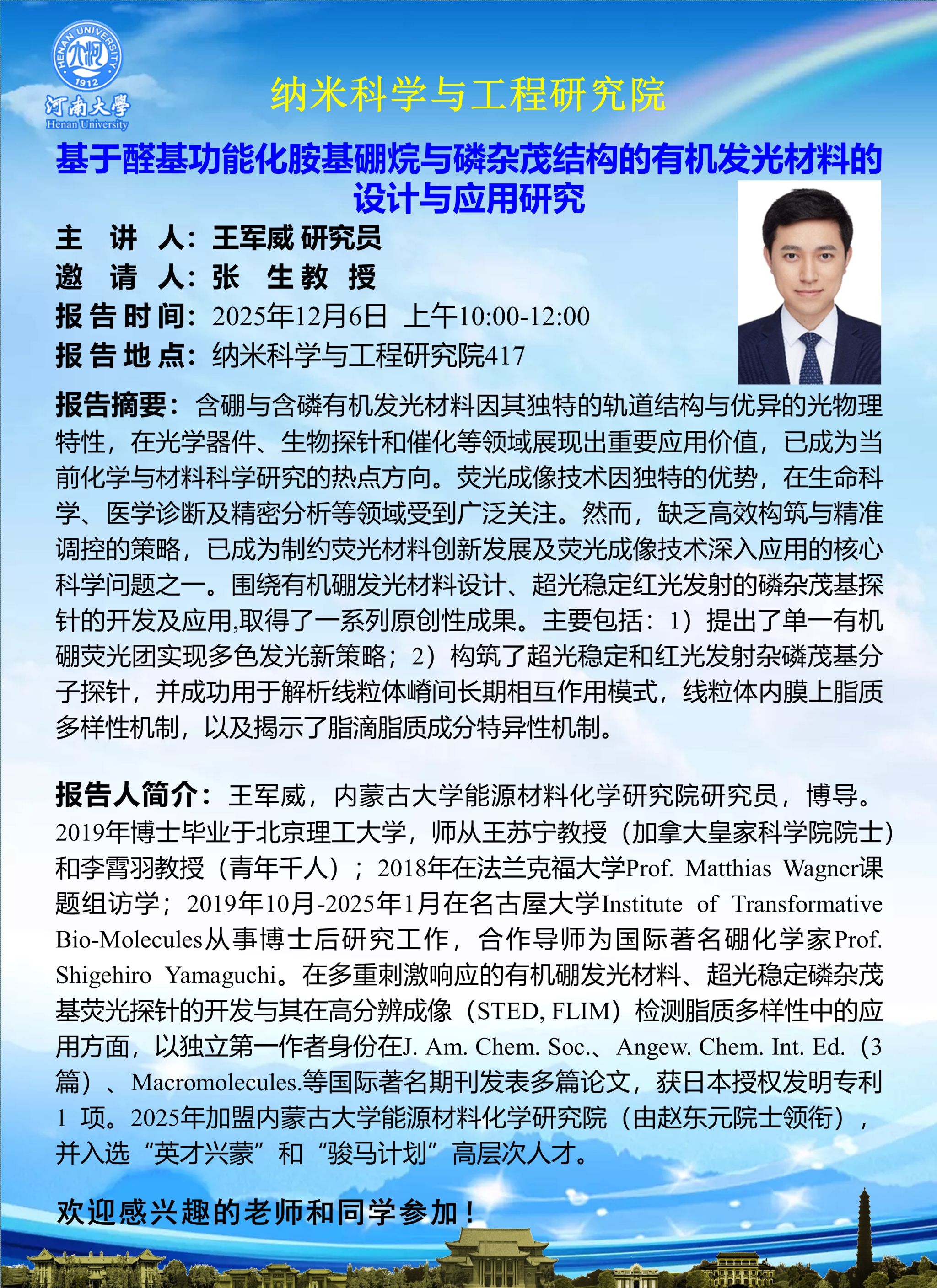 王军威:基于醛基功能化胺基硼烷与磷杂茂结构的有机发光材料的设计与应用研究(时间:12月6日)