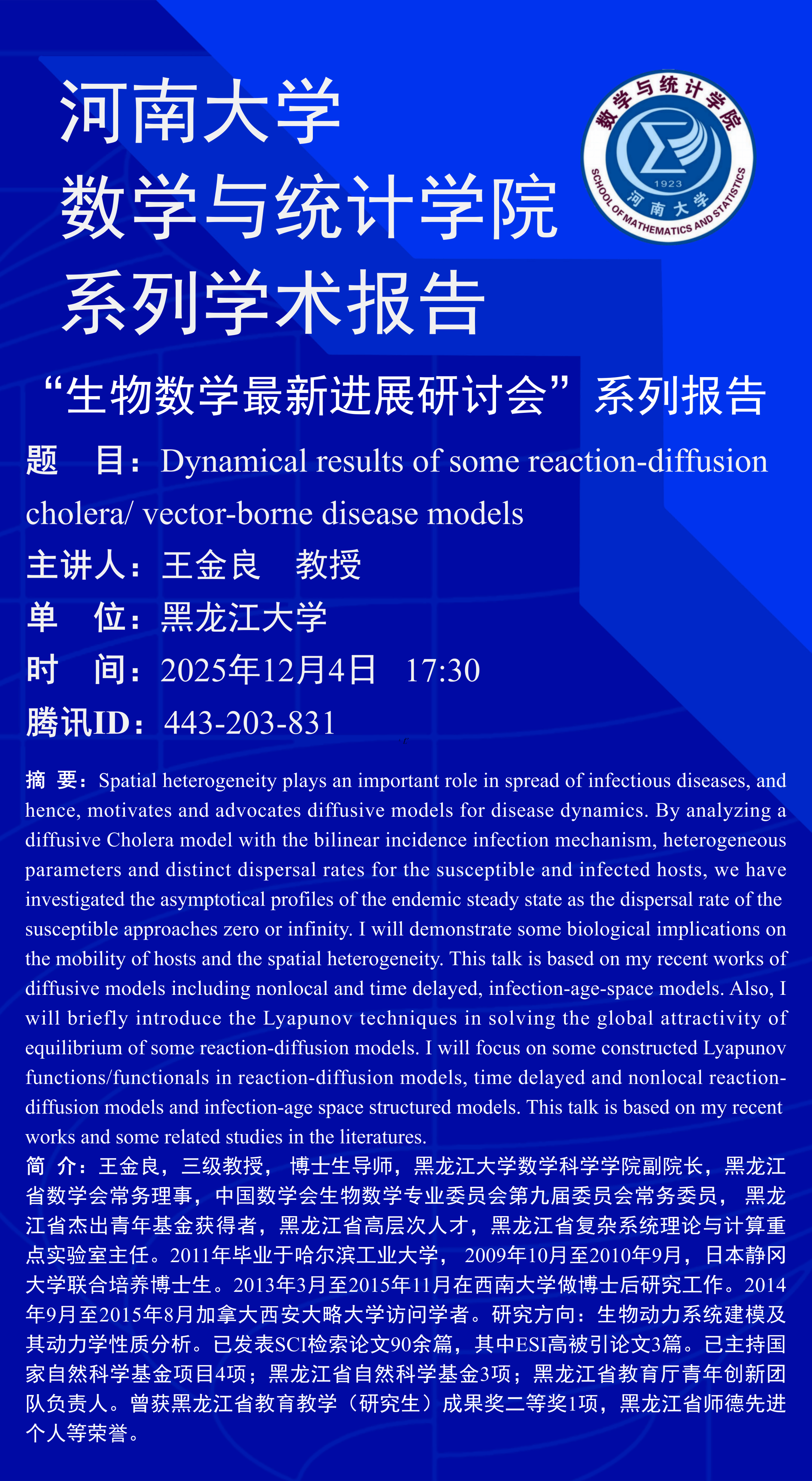 王金良:Dynamical results of some reaction-diffusion cholera/ vector-borne disease models(时间:12月4日)