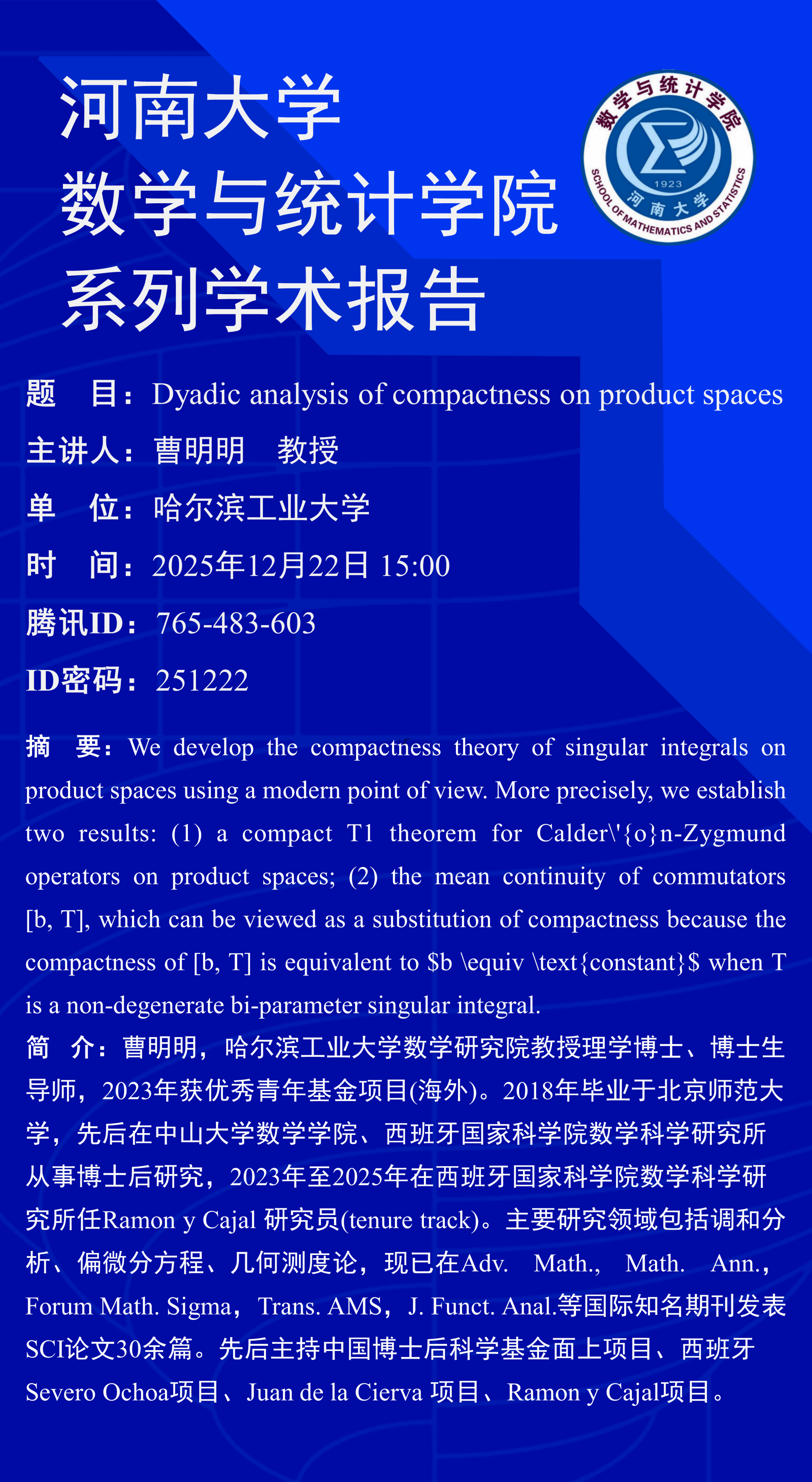 曹明明:Dyadic analysis of compactness on product spaces(时间:12月22日)