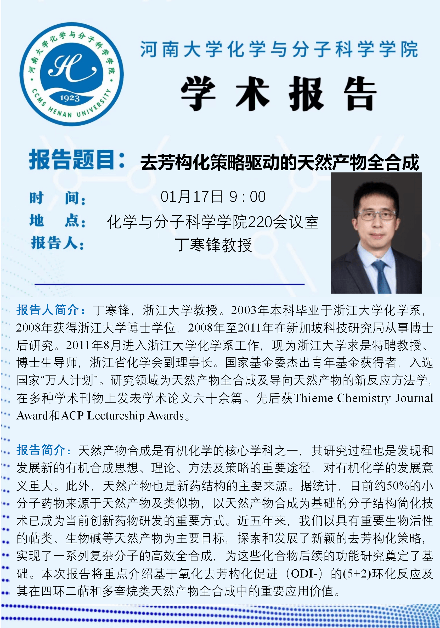 丁寒锋:去芳构化策略驱动的天然产物全合成(时间:1月17日)