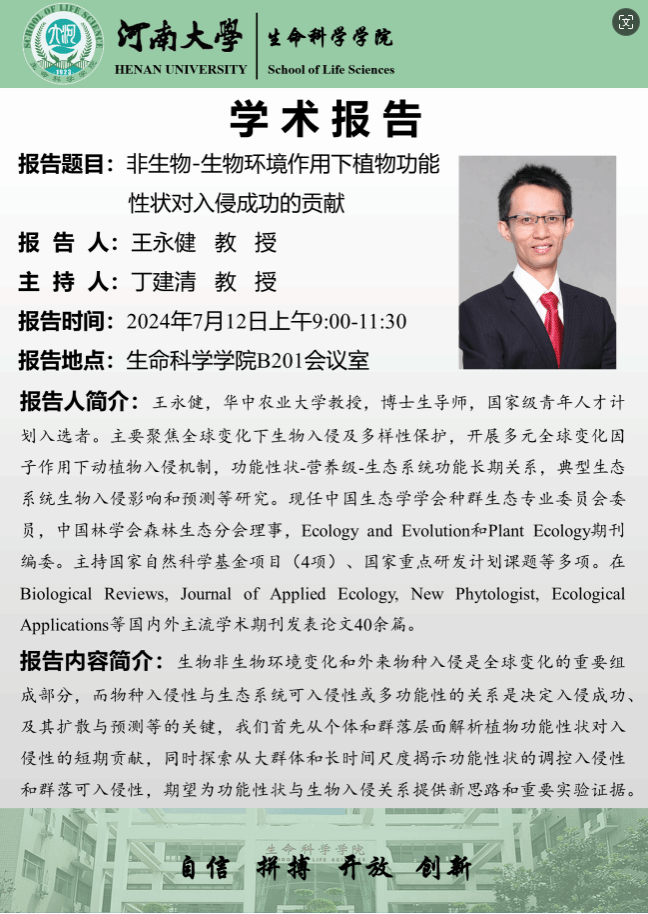 上一篇:郭文永:基于生态适应策略理论的外来植物入侵机制综合研究(时间:7月12日)