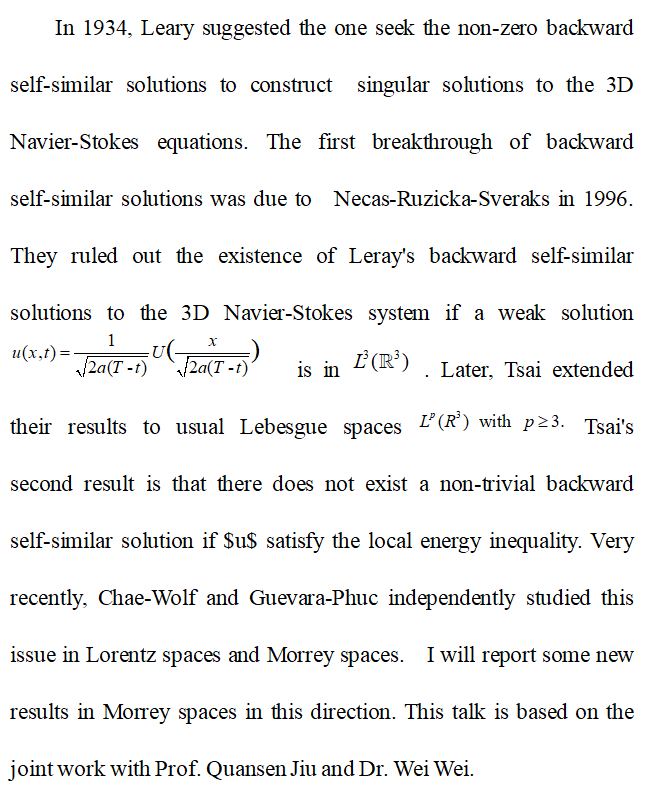 报告2:Leray's Backward Self-similar Solutions to the 3D Navier-Stokes Equations in Morrey Spaces,王艳青,时间:10:00。
