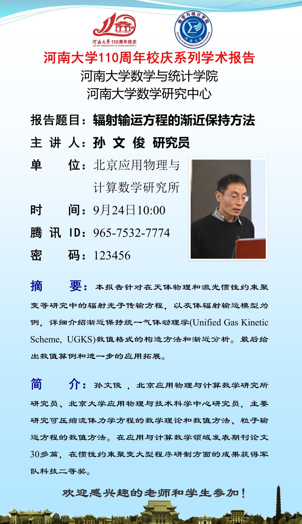 校庆学术活动:孙文俊:辐射输运方程的渐近保持方法(时间9.24)