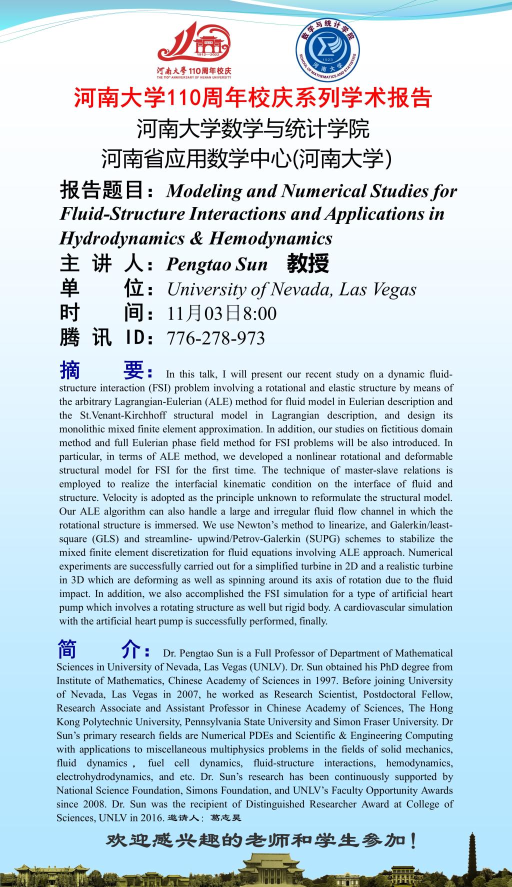 Pengtao Sun:Modeling and Numerical Studies for Fluid-Structure Interactions and Applications in Hydrodynamics & Hemodynamics(时间11.3)