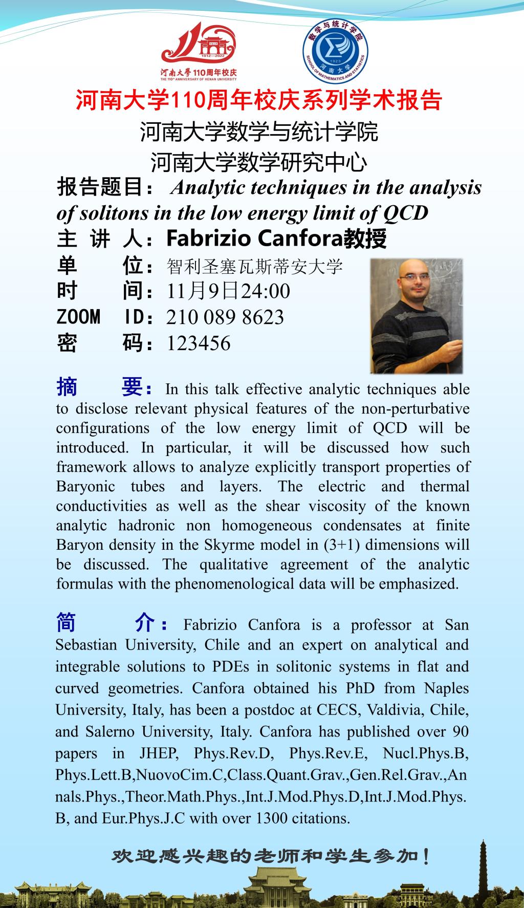 Fabrizio Canfora教授:Analytic techniques in the analysis of solitons in the low energy limit of QCD(时间:11.9)