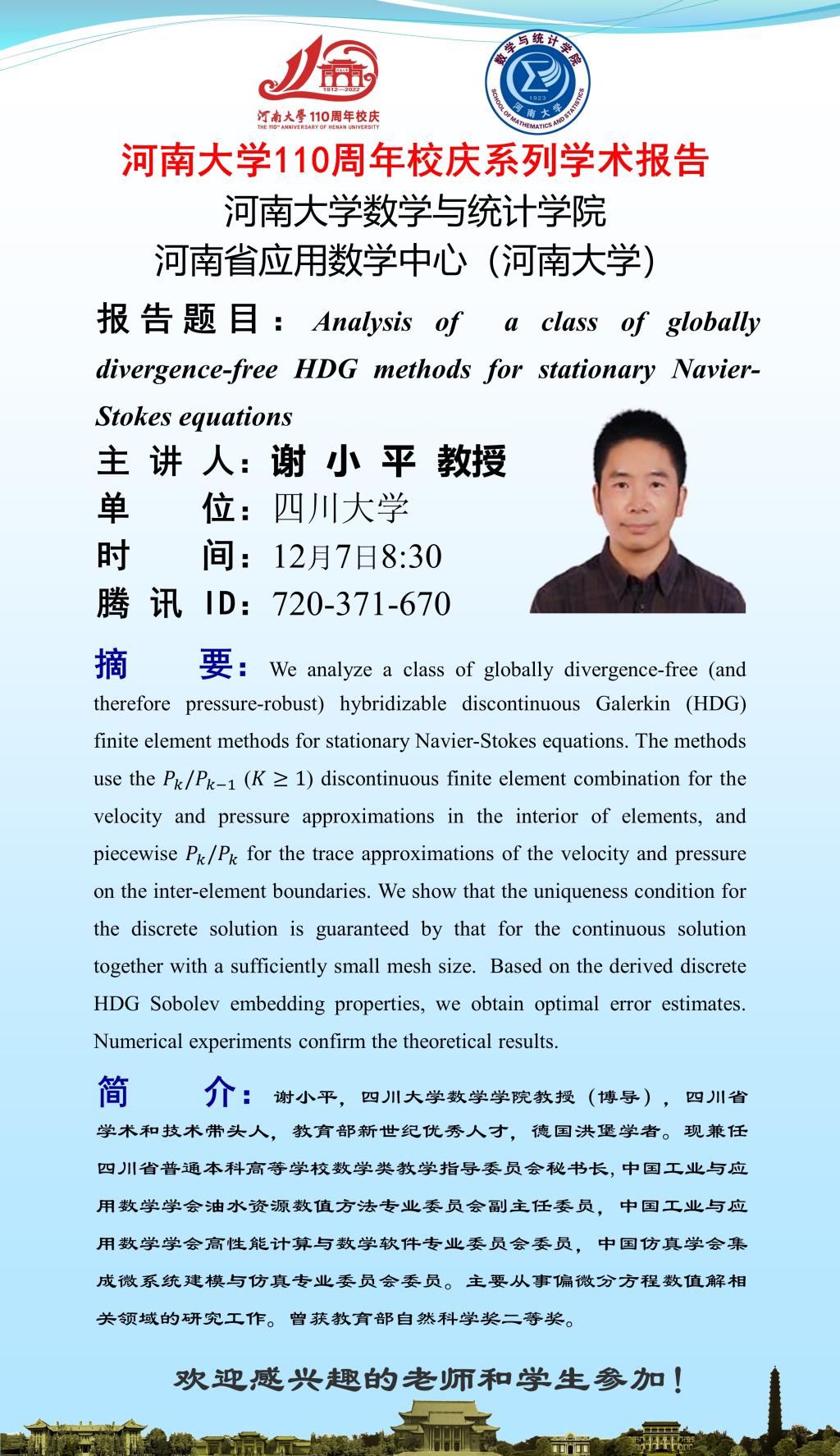 谢小平:Analysis of a class of globally divergence-free HDG methods for stationary Navier-Stokes equations(时间:12.7)