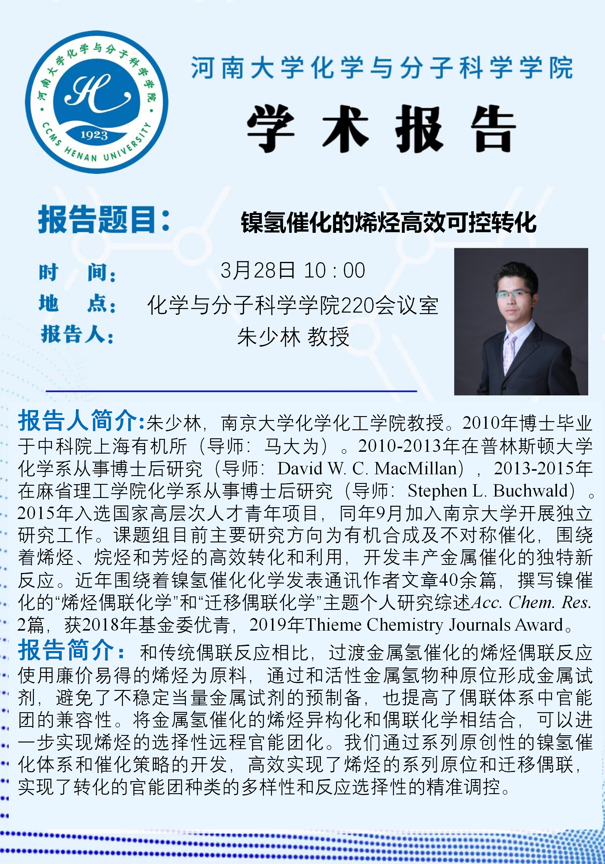 朱少林:镍氢催化的烯烃高效可控转化(时间:3月28日)